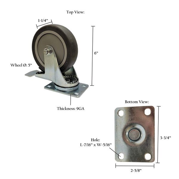 This standard swivel wheel makes maneuvering cargo quick and easy. Rubber wheel is safe on flooring and provides smooth transportation for cargo. Wheel has locking capability. Plate dimensions: 5" x 1-1/4"